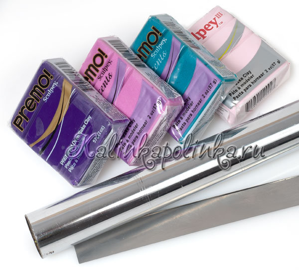 премо сине-зеленый с перламутровым эффектом , скальпи нежно-розовый, премо фиолетовый, премо розовый перламутр, скалка, нож. Перед работой глину хорошенько разомните.