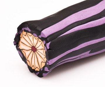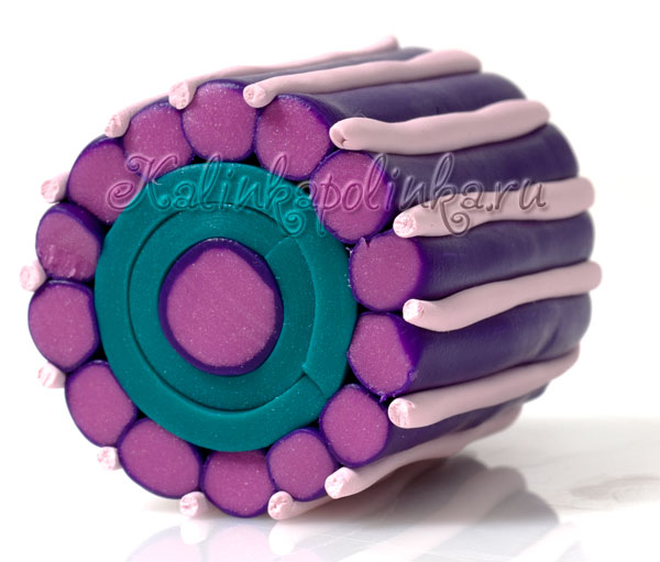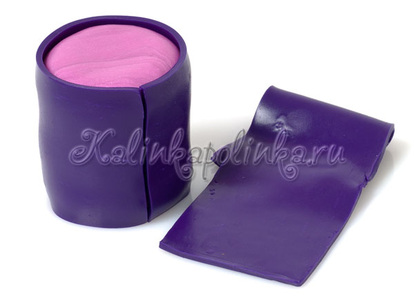 кусочек розового оборачиваем тонким пластом фиолетового, получается простейшая колбаска, которую нужно ужать до длины примерно 60 см. При оборачивании срезайте пласт глины так, чтобы они состыковывались без промежутков и наслоений