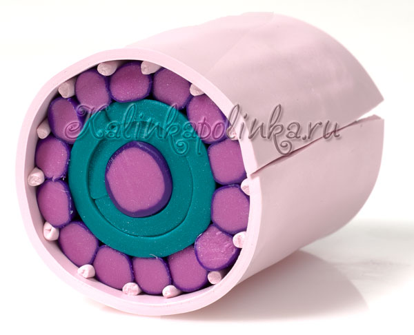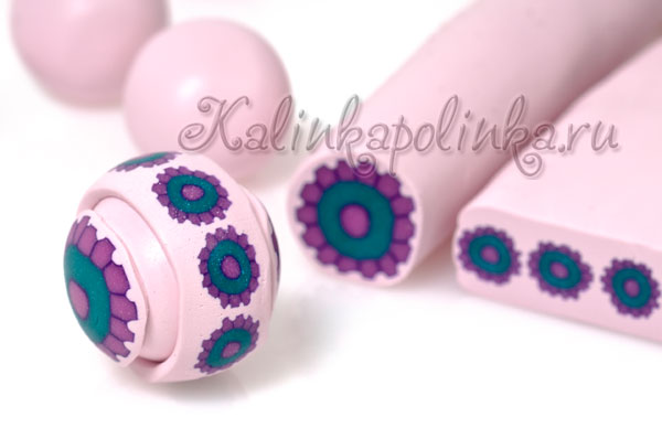 Полученную конструкцию прижимаем слегка пальцами для того, чтобы вышел лишний воздух. Делаем 2 среза с круглой колбасы и один срез с плоской колбасы. Подготовленные заранее бусины из светло-розового оборачиваем срезами. Если срез плоской колбасы слишком длинный, его можно ужать, вытянуть по длине и немного сжать по ширине.