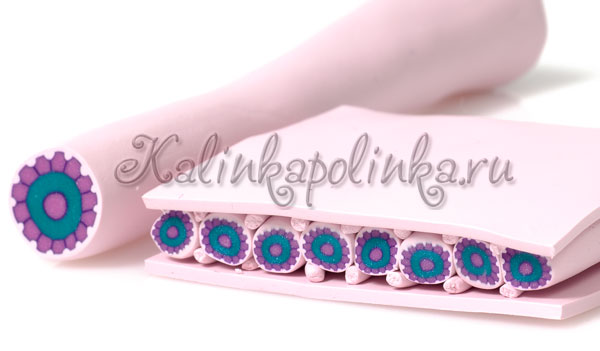 после этого оставшуюся трость нарезаем на много частей, сколько получится и укладываем вокруг голубой колбаски, в промежутки вставляем тонкие светло-розовые трубочки. На этом фото размер колбасы значительно больше натурального, чтобы хорошо был виден рисунок.