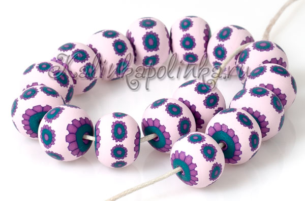 Катаем бусины в руках, перчатки обязательны, так как розовый очень быстро пачкается. Я делаю отверстия до запекания зубочисткой, сначала с одной стороны, а потом с другой навстречу. Вот такие получились бусины: