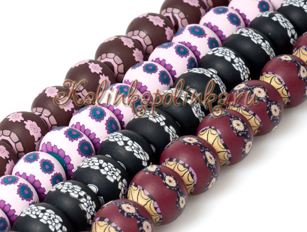 А эти бусины я делала в процессе утилизации колбас. Здесь на черном фоне колбаски по уроку черно-белый цветок, на бордовом фоне серединки из маков, на коричневом фоне остатки колбасок с прошлого урока с цветами. Боковой рисунок почти не видно, когда бусины плотно собраны, но они пока не в сборке, в украшении можно будет поиграть с промежуточными бусинками.