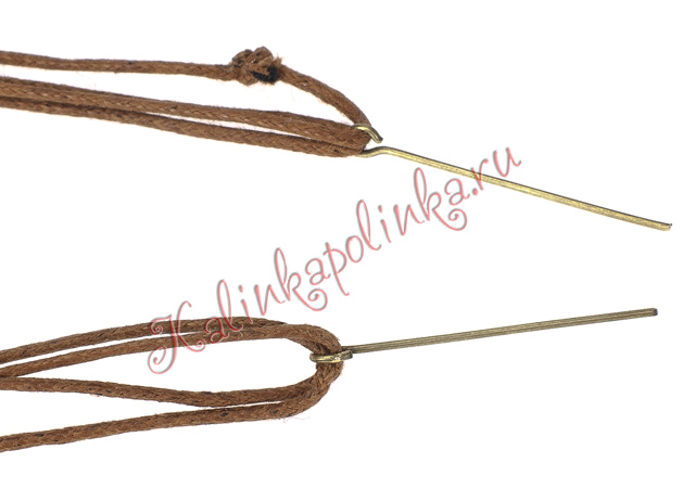 Чтобы продеть несколько шнуров в отверстие бусины крепим всю связку к штифту. Если привыкли собирать бусины от центра, то и со второй стороны нужно сделать такую "иголку", завязав узелок, не у самого ушка штифта, а немного ниже.