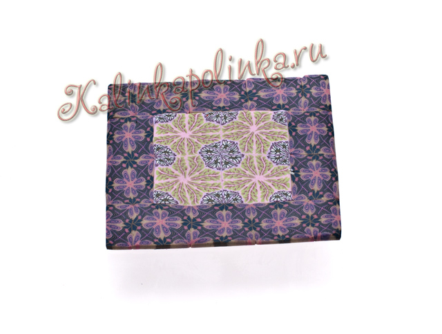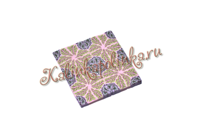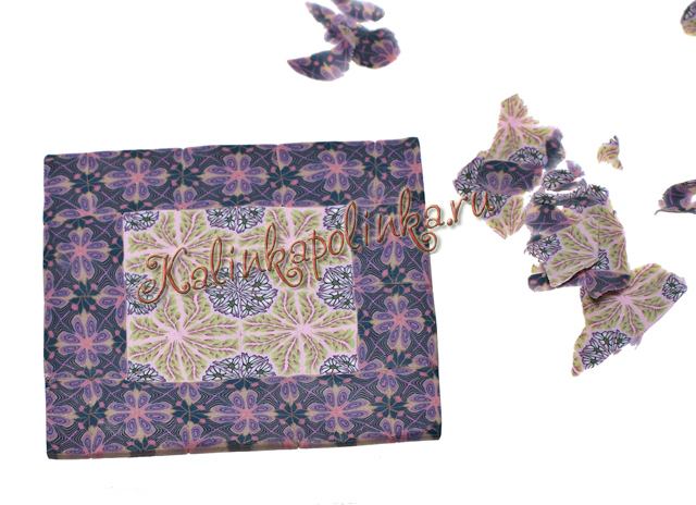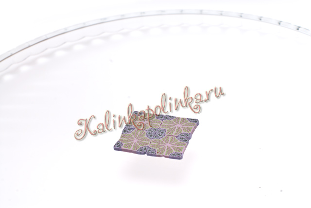 Листик соединяю с цветочком. Получается простой треугольник, два треугольника-квадрат, четыре квадрата- светлого зеленого цвета с фиолетовыми оттенками калейдоскоп. Начинаю приклеивать от центра. Сначала я пробовала на дно с обратной стороны приклеивать бумагу в клеточку, чтобы складывать все один к одному, но вторую тарелку стала просто на глаз делать и ошибки в процессе легко исправляются, и нужно иногда переворачивать и смотреть с той стороны- ровно или нет, нет ли пузырьков. Приклеиваю первые четыре среза. Сначала они немного торчат с боков и между ними есть промежутки небольшие: