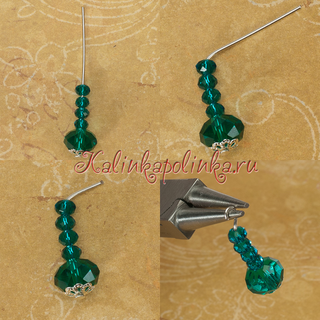 Возможно, кто-то пробует создавать серьги впервые, поэтому повторим еще разок, как загнуть штифт. Нанизываем на штифт бусинки, сгибаем его в сторону плоскогубцами, тонкие штифты лучше пальцем, отрезаем так, чтобы до бусины осталось 7-8 мм. круглогубцами сворачиваем петельку в два движения. Первым движением сворачиваем штифт, удерживая за самый кончик, вторым движением ( см. фото) перехватываем штифт на сгибе: