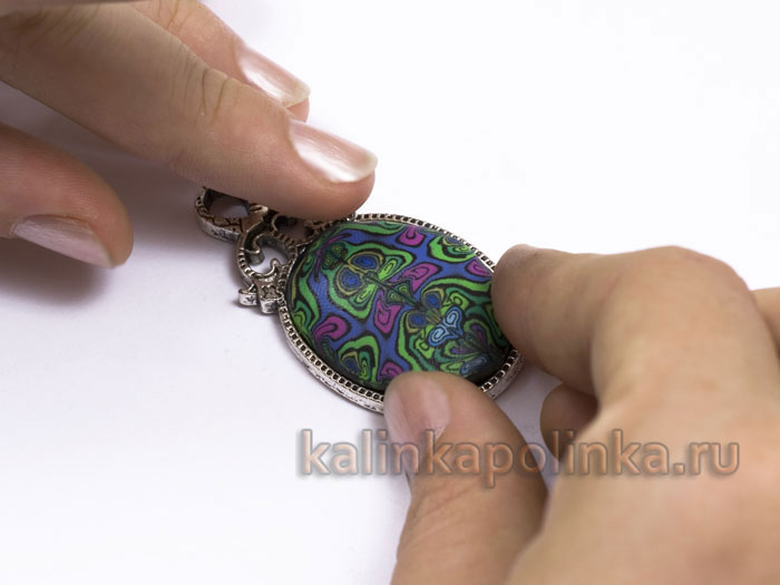 Обычно все металлические части после запекания нужно приклеивать, но в этом случае за счет шероховатой поверхности донышка и боковинок рамки кулон держится очень крепко.