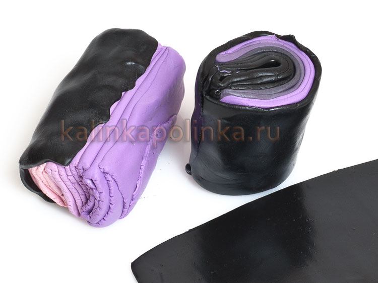 после этого раскатываем черный, не слишком тонко. Оборачиваем более темную часть целиком, а светлую только с одной стороны.