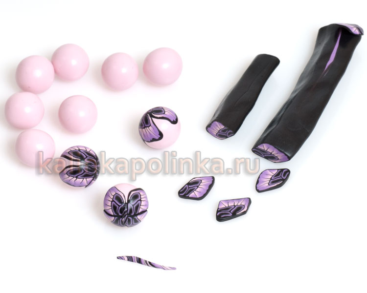 после этого кусочек колбасы ужимаем до более тонкого размера. Отрезаем тонкие кусочки (меньше 1 мм). у меня две колбаски : одна потолще для верхнего крыла, а другая потоньше и покруглее для нижнего крыла, рисунок одинаковый. между крылышками для тельца вкладываю скрученные обрезки, небольшую трубочку. Катаю бусины в руках, чтобы границы сгладились. Получается, что бабочка как-будто нарисована черным контуром. делаем отверстия, если их нечем просверлить позже.
