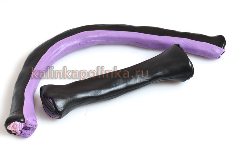 После этого ужимаем полученные колбаски. Начинаем ужимать из центра, аккуратно прижимаем пальцами, не перекручиваем, как будто просто держим в руках и медленно растягиваем. Черную колбаску примерно до 14 см, светлую до 26 см.