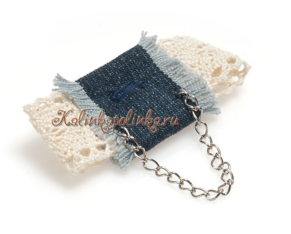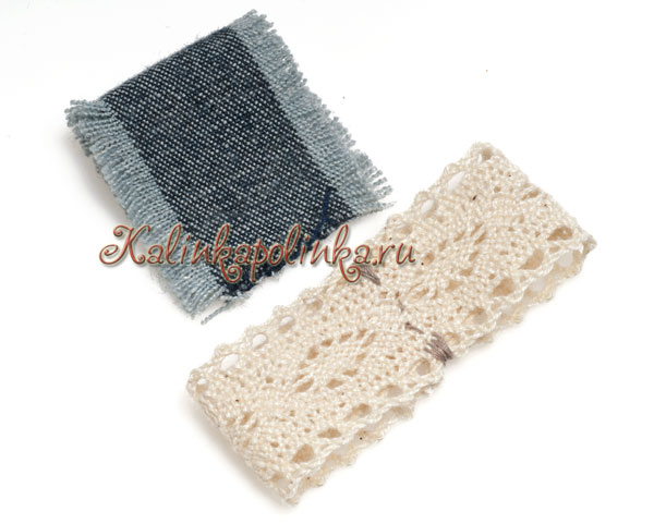 На джинсовом кусочке делаю бахрому и сшиваю пополам с изнанки, потом выворачиваю. Кружева складываю бантиком и тоже сшиваю в центре.
