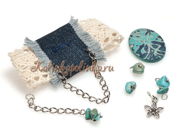 Из одной овальной детальки я решила сделать брошку. Для этого мне пригодится кусочек джинсовой ткани (отрезаем по направлению темных нитей), кусочек кружева, основа для броши, цепочка, бирюзовая крошка, подвеска- цветочек, соединительные колечки, штифты с шариком, иголка с ниткой, плоскогубцы, кусачки, клей контакт-гель (или любой моментальный клей)