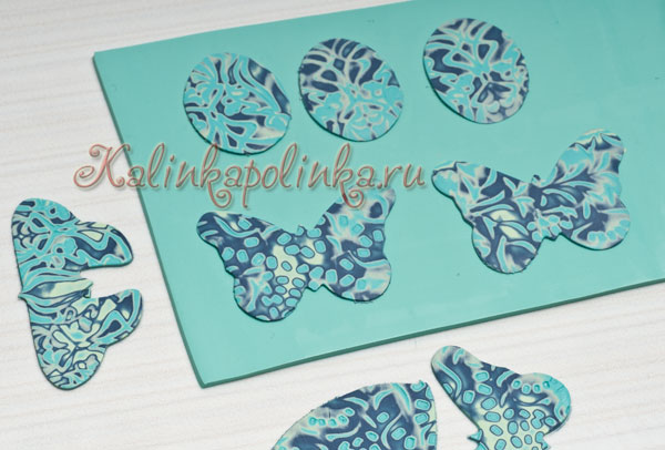 теперь раскатываем пластику одного цвета для основы, ножом срезаем тоненькие детали и прикатываем на основной цвет скалкой на плитку или стекло.