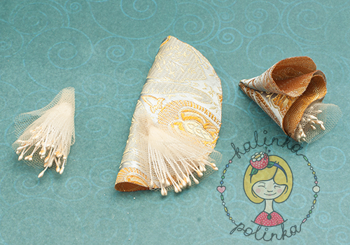 Теперь сделаем бутончики. Тычинки сворачиваю пополам, капаю клеем и оборачиваю фатином, затем оборачиваем тканью, образуя кулечек.