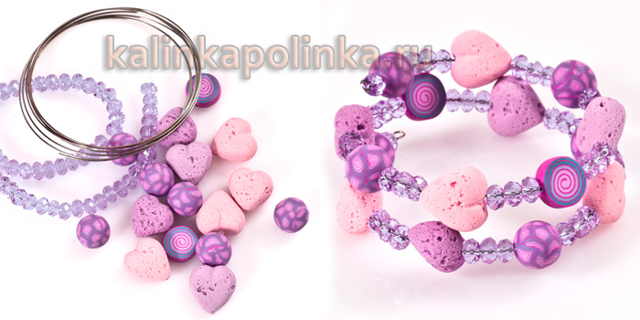 Еще один простой вариант применения бусин «Браслет на проволоке с памятью». Бусин можно использовать все, что есть, парные-непарные, большие и маленькие, бисер, металлические бусины, в общем собираем все на проволоку, с концов закругляем проволоку круглогубцами. Проволока с памятью так называется, потому что она держит форму. Если браслет сделан из 2 и более витков, то застежка не требуется.