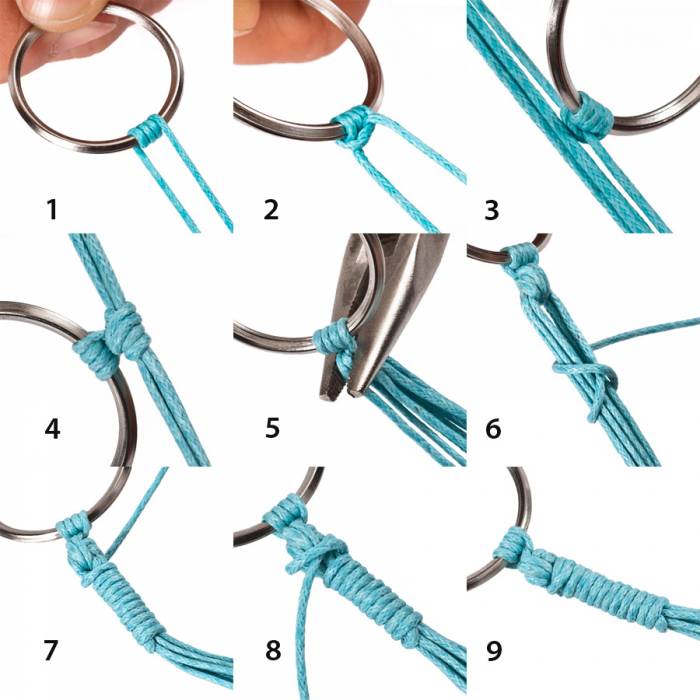 Берем одну веревочку посерединке. Делаем пару витков на кольце и завязываем узел.
