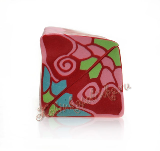 Ужимаем эту колбасу. Кажется, что ужать треугольную колбасу сложнее, чем круглую. Но это легко. Одной стороной колбаска лежит на плоскости, уголок расширяем, потом переворачиваем на другой бок, потом на другой. Отрезаем неровные края, не бережем пластику, если рисунок неодинаковый: