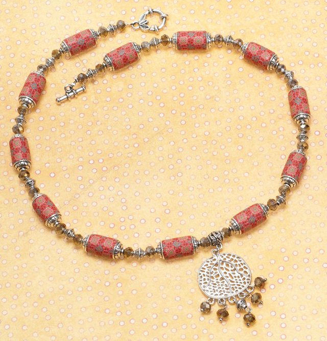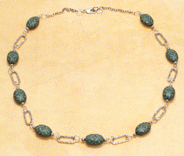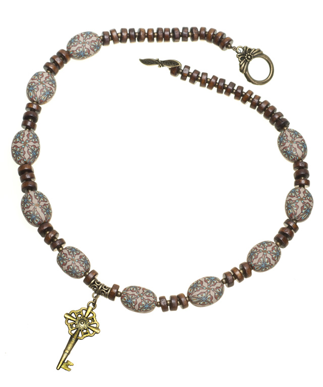 В этих бусах такая же техника. Для разделения использую шарики бронзового цвета и деревянные бусины: