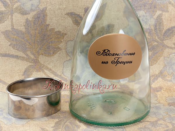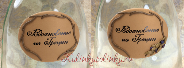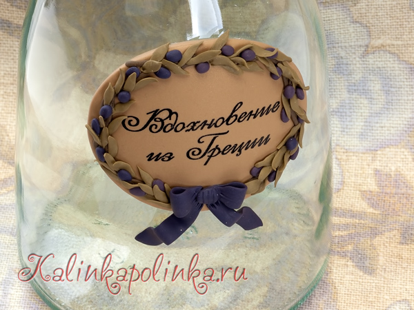 потом вырезаю формочкой овал, снимаю аккуратно со стекла, приклеиваю на бутылку. Запекаю вместе с бутылкой в печке по инструкции к глине ( 110-130 градусов полчаса, часто в инстркуции время меньше указано, но исхожу из того, что бутылка тоже должна прогреться):