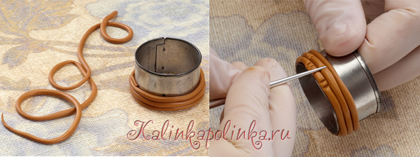 Для корзинки я подобрала формочку по размеру, подойдет все, что можно запекать (картон, металл, стекло). Глину раскатала в колбаску, обернула вокруг формы, нанесла спицей (можно зубочисткой) рисунок. Запекла в духовке: