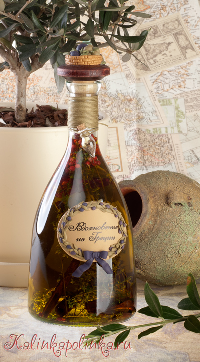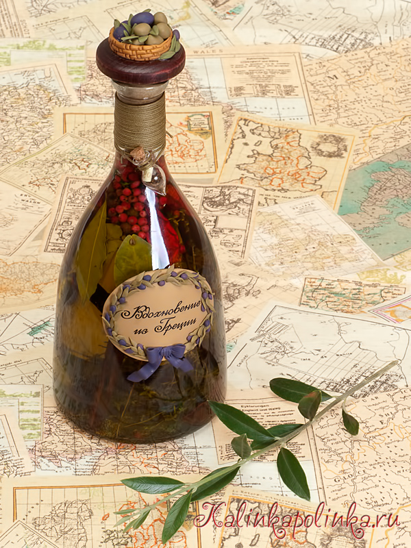 Путешествия вдохновляют нас на новые проекты и дарят положительные эмоции на годы вперед) Таким источником для меня на весь этот год была Греция. Очень доброжелательные жители Крита, запах пряных трав в воздухе, море, солнце каждый день. В поездке мы покупали оливковое масло с травами, перцами и лавровым листом, им очень хорошо заправлять салаты и, конечно, вспоминать о счастливых моментах) С момента путешествия прошел год, нужно делать уже новые запасы). Так вот сегодня я предлагаю сделать бутылку для оливкового масла. Для основы использую бутылку из-под вина.