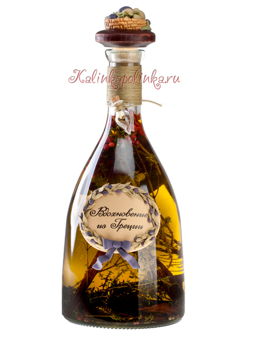 Все готово. Если любите потертости, то можно дополнительно затонировать масляной краской или акриловой. Я не стала подкрашивать ничего. Теперь я заполняю бутылку чабрецом, перчиком, лавровым листом, палочками корицы. Можно и чеснок добавить, если любите.