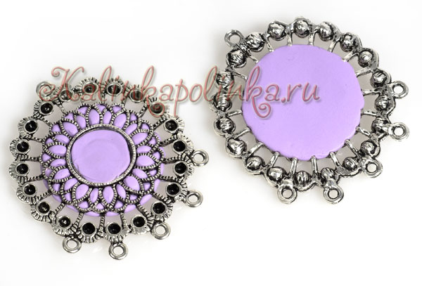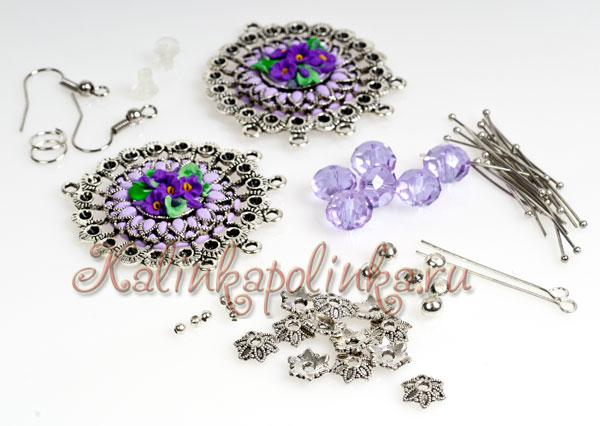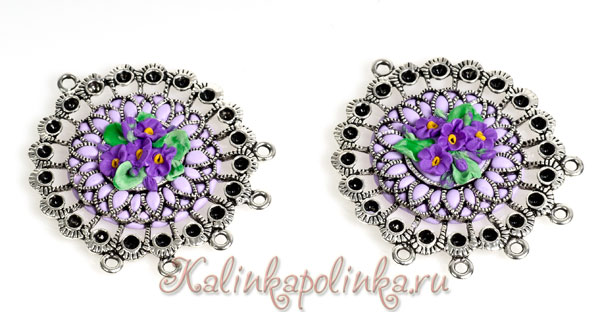 Для лепки нам понадобится полимерная глина нескольких оттенков фиолетового и зеленого. На фото один фиолетовый позже я заменила на цвет потемнее. Из инструментов понадобится только зубочистка. Дополнительные материалы любая рамочка для бижутерии, я использую коннекторы на 6 петель.