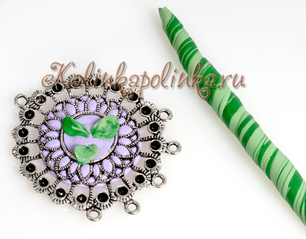 Центральную часть коннектора мы оформим цветами и листьями. Для листиков я использовала два зеленых цвета, смешала их, оторвала небольшие кусочки и зубочисткой придала форму и текстуру листочков.
