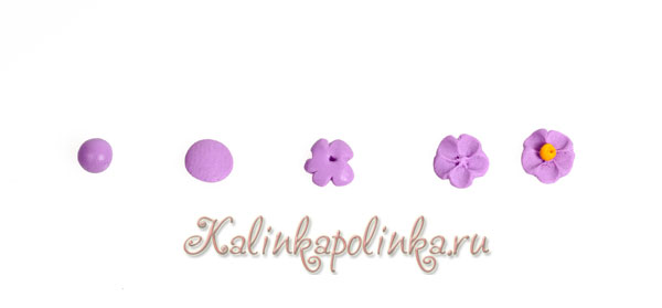 Цветочек делаем по такой схеме. Шарик сплющиваем, зубочисткой с краев немного намечаем лепестки. Чтобы придать внутренний рисунок лепестка, я отрезала кончик зубочистки и каждый лепесток придавила, сам цветочек я держала на указательном пальце левой руки, зубочистка в правой руке. В центр я скатала желтенький шарик и прижала его острым кончиком.