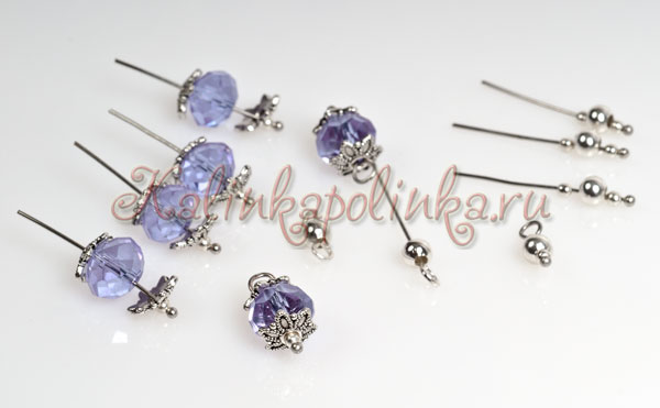 Я не стала использовать много бусин, чтобы не утяжелять серьги. Собираем подвесочки. На центральной петельке на штифте с ушком будет шарик 4 мм, за него я закреплю подвеску со стеклянной бусинкой (на штифт надеваю шарик 2 мм, шапочку, бусинку, вторую шапочку, штифт круглогубцами сворачиваю петелькой) Подвесок со стеклянными бусинками я делаю по три штуки на каждую сережку. Для крайних петелек я на штифт надеваю только шарики (2мм-4 мм-2 мм)