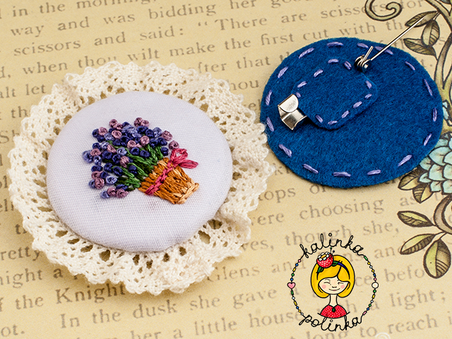С обратной стороны можно пришить кружево или фатин. У меня кружевная резинка 710-113. Пришиваю основу для броши к фетру (диаметр кружочка 4см).