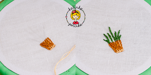 Нужно приложить к рисунку геометрическое мышление, чтобы оценить, что будет на втором плане, что оставить для первого. Начинаем со второго плана- с горшочка. Для вышивки используем стебельчатый шов: